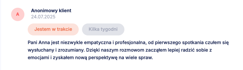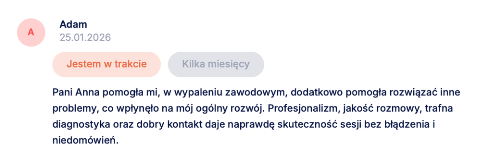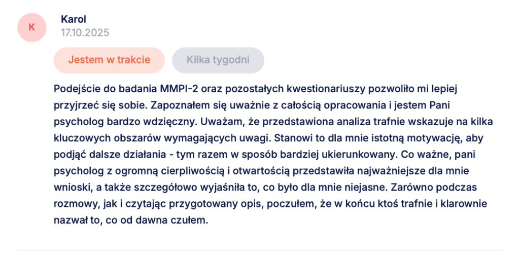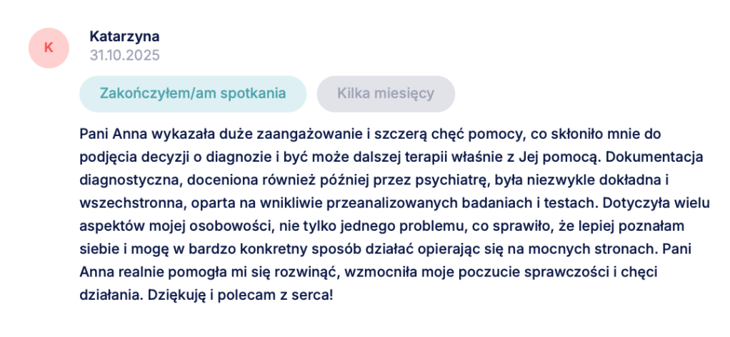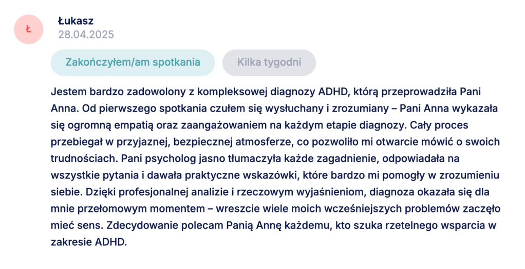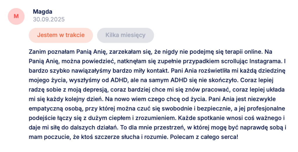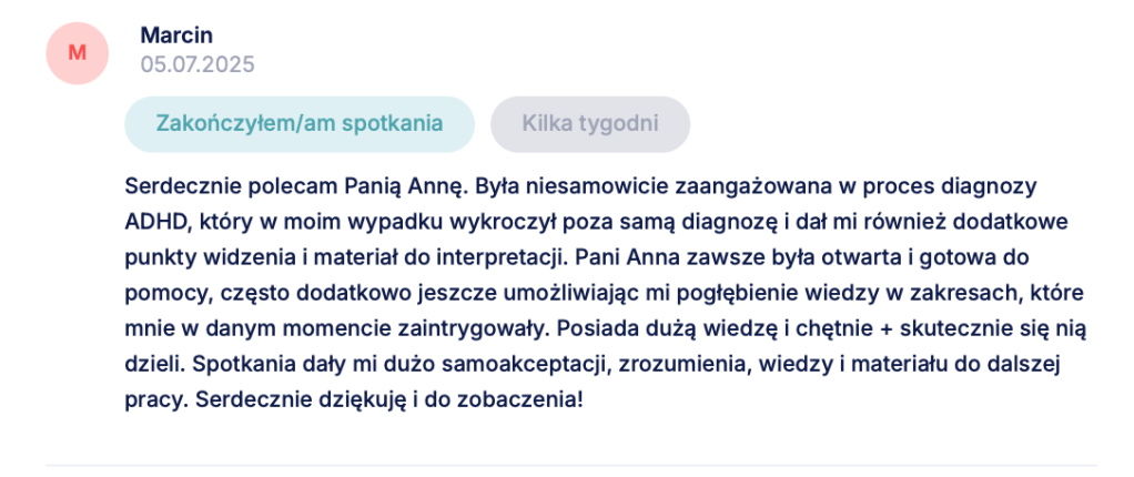 Dobra diagnoza – niezależnie od tego, czy potwierdzi ADHD, czy wskaże inne źródła trudności – nie polega na tym, że znajdziemy elegancką nazwę dla Twoich objawów. Jej wartością jest to, że po procesie możesz inaczej spojrzeć na własne wybory, reakcje, schematy: z większym zrozumieniem, a z mniejszą skłonnością do deprecjacji siebie. Opinie osób, które przeszły ze mną ten proces, są dla mnie właśnie miernikiem tego przesunięcia. Od co jest ze mną nie tak, do teraz widzę, jak działam i wiem, co chcę i mogę z tym zrobić dalej.